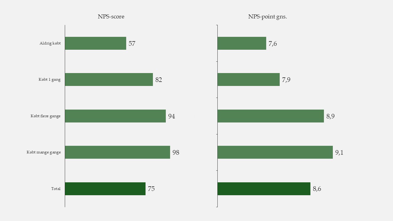 NPS giver en enkel temperaturmåling på kundernes tilfredshed og brandets relationelle styrke. Scoren varierer naturligt afhængigt af målgruppen – fx vil en kunde, der handler ofte, typisk give en markant højere score end en person, der aldrig har købt noget. Netop derfor kan NPS anvendes bredt, men bør analyseres opdelt på segmenter for at få reel værdi.