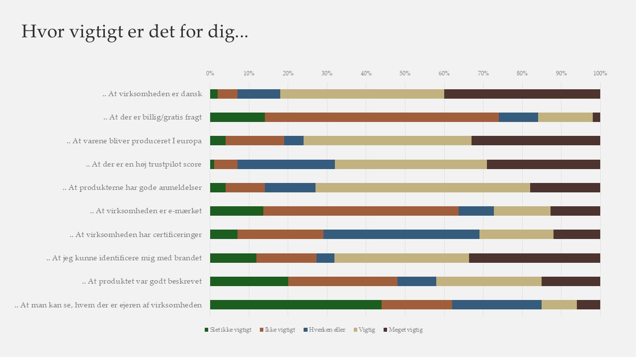- vurdere, hvor vigtigt forskellige værdier er for kunderne (fx “Hvor vigtigt er det, at virksomheden er dansk?”)