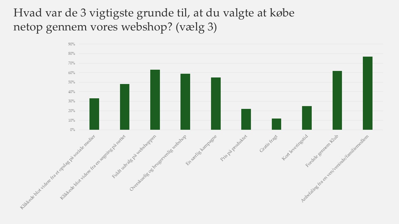 Denne indsigttype er værdifuld, fordi adfærdsdata ofte kun viser fravær af køb – ikke hvorfor købet udebliver. Et målrettet spørgeskema kan dermed give direkte input til både prisstrategi, sortiment og konverteringsoptimering.